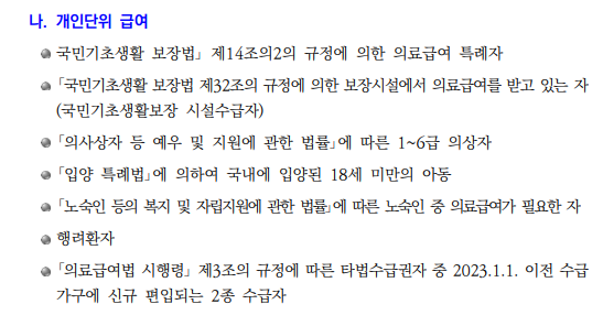 - 의료급여: 의료비(진료비, 약제비 등)의 본인부담금을 국가가 일부 또는 전액 부담하는 제도입니다.