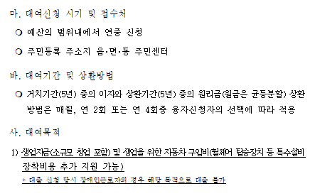 - 창업 자금: 소규모 사업, 점포 개설, 장비 구입 등
